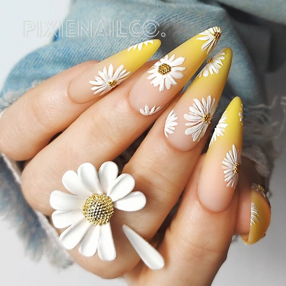 Yellow Ombre Daisy Press On Nails Sculpted Hard Gel Press Ons Luxury Custom Nails Summer Floral Etsy Uk